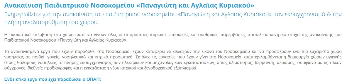 The key objectives of OPAP’s Children Hospital Renovation program were to: