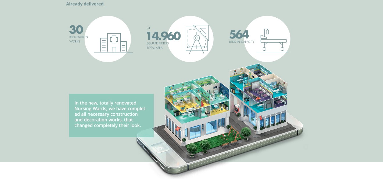 The Children Hospitals renovation initiative was completed in 2022, offering a significant legacy for the public health. In total, 30 renovation projects were completed, of 14.960 sq.m2 total area, which include 23 nursing units that surpass international standards and accommodate 564 beds.