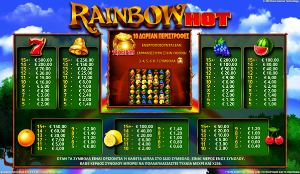 Το "Rainbow Hot” είναι ένα παιχνίδι με 7 κυλίνδρους και την λειτουργία πτώσης κυλίνδρων, toppling reels. Όλες οι πληρωμές αφορούν συνδυασμούς για όμοια σύμβολα. Τα κέρδη συνόλου μπορεί να περιέχουν σύμβολα οριζόντια ή κάθετα δίπλα στο ίδιο σύμβολο στην οθόνη. Τα ποσά από τα κέρδη συνόλου πολλαπλασιάζονται με τον αριθμό του πολλαπλασιαστή του βασικού στοιχήματος. Πληρώνονται μόνο τα υψηλότερα κέρδη συνόλου.