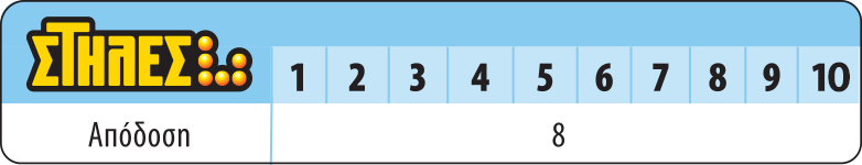 If 12 ‘EVENS’ και 8 ‘ODDS’ numbers are drawn, then you win 10€ (2 times your stake).