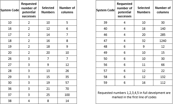 There are 7 stand-alone systems that can be played in any area of the slip and are distinguished by the characteristic that the requested numbers are 6. The remaining 18 can only be used for combination systems. The system code is filled in the "Codes" field. Detailed information can be found by downloading the Autonomous Screening Program for free