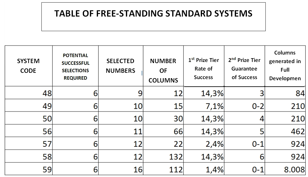 Standard LOTTO systems offer you the possibility to play with fewer columns and lower costs than a full system, choosing the same amount of numbers. Standard systems do not offer the same chance of success as a full system, even if you have correctly predicted all 6 numbers.