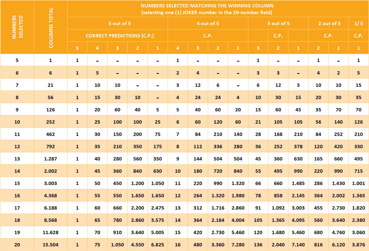 If TZOKER number is correctly predicted, then all winnings mentioned above are included in categories 5+1, 4+1, 3+1, 2+1, ή 1+1.
