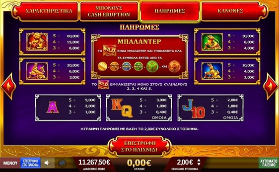 Το « Fortune Gong Cash Eruption » είναι ένα παιχνίδι με 5 κυλίνδρους και 10 γραμμές