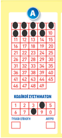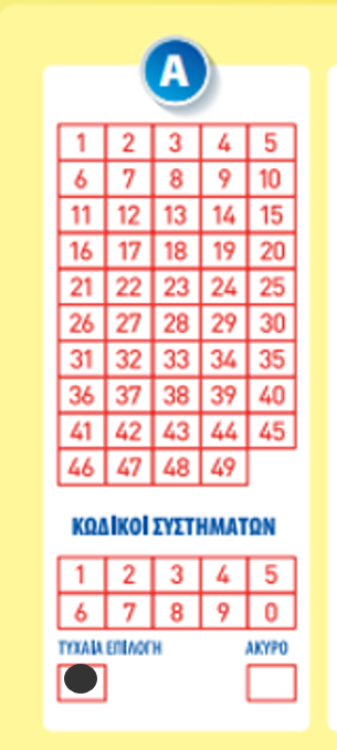 Α. Επιλέγοντας μόνο ‘Τυχαία Επιλογή' χωρίς να επιλέξεις αριθμούς, η τερματική μηχανή θα δημιουργήσει μια απλή στήλη με τυχαία επιλογή 6 αριθμών, από το 1 έως και το 49.