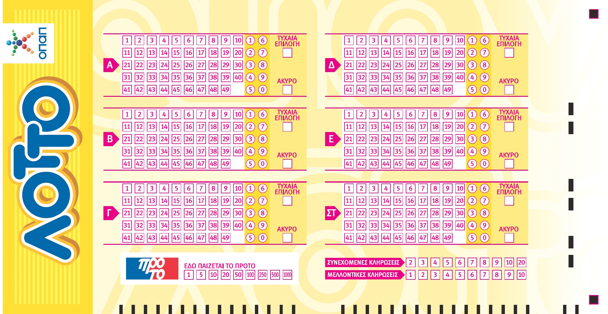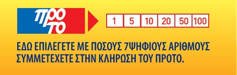 Μπορείς να συμμετέχεις στο παιχνίδι ΠΡΟΤΟ (με έως και 186 συνεχόμενους αριθμούς), συμπληρώνοντας την αντίστοιχη περιοχή στο κάτω μέρος ενός δελτίου ΛΟΤΤΟ.