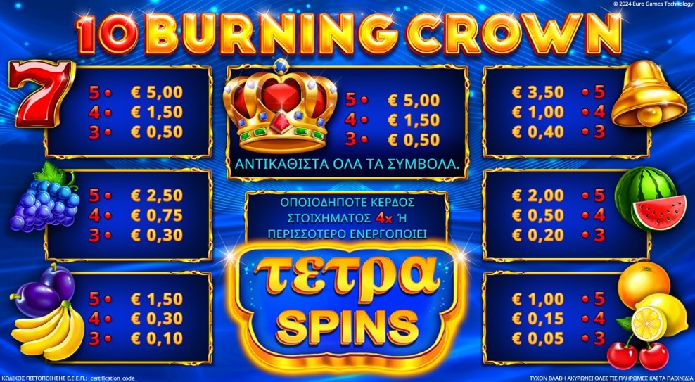 Το “10 Burning Crown τετρα Spins ” είναι ένα παιχνίδι με 5 κυλίνδρους και 10 γραμμές πληρωμής. Όλες οι πληρωμές πρέπει να είναι σε διαδοχικούς κυλίνδρους ξεκινώντας από τον πρώτο κύλινδρο στα αριστερά. Πληρώνεται μόνο η γραμμή πληρωμής με το μεγαλύτερο ποσό. Όλα τα κέρδη γραμμών που εμφανίζονται βασίζονται στο τρέχον στοίχημα.