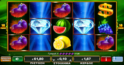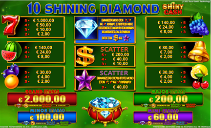Το “ 10 SHINING DIAMOND SHINY CASH” είναι ένα παιχνίδι με 5 κυλίνδρους και 10 γραμμές πληρωμής. Όλες οι πληρωμές αφορούν συνδυασμούς για όμοια σύμβολα και πληρώνουν από αριστερά προς τα δεξιά. Όλες οι πληρωμές πρέπει να είναι σε διαδοχικούς κυλίνδρους ξεκινώντας από τον πρώτο κύλινδρο αριστερά εκτός των Scatter. Τα κέρδη από τα Scatter προστίθενται στα κέρδη γραμμών πληρωμής. Πληρώνεται μόνο ο μεγαλύτερος συνδυασμός ή /και τα κέρδη των Scatter ανά γραμμή πληρωμής.