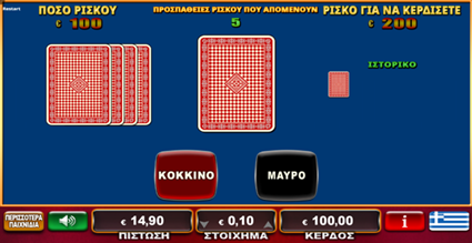 Για να ρισκάρετε οποιοδήποτε κέρδος μικρότερο του 2.500,00€ πατήστε το κουμπί ρίσκο. Στη συνέχεια επιλέξτε κόκκινο ή μαύρο. Εάν η επιλογή κόκκινο/μαύρο είναι σωστή το ποσό του ρίσκου διπλασιάζεται (Χ2). Εάν η επιλογή κόκκινο/μαύρο δεν είναι σωστή το ποσό του ρίσκου χάνεται και το παιχνίδι τελειώνει. Η πιθανότητα κέρδους είναι 50%.