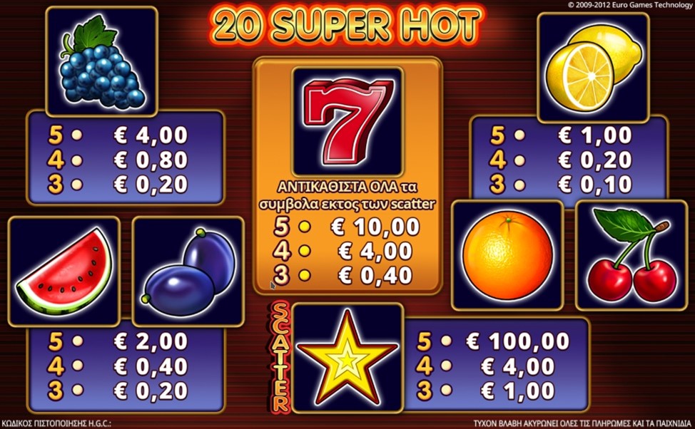 Το 20 SUPER HOT είναι ένα παιχνίδι με πέντε (5) κυλίνδρους και 20 γραμμές πληρωμής.