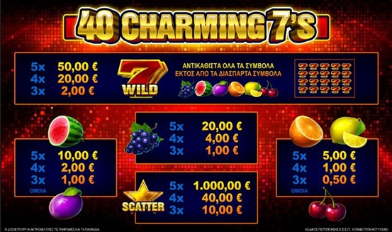 Το “40 Charming 7’s” είναι ένα παιχνίδι με 5 κυλίνδρους και 40 γραμμές πληρωμής. Όλες οι νίκες πληρώνουν διαδοχικά από τα αριστερά προς τα δεξιά εκτός από τα διάσπαρτα σύμβολα που αποδίδουν σε οποιαδήποτε θέση.