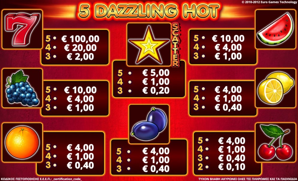 Το 5 DAZZLING HOT είναι ένα παιχνίδι με πέντε (5) κυλίνδρους και πέντε (5) γραμμές πληρωμής. Όλες οι πληρωμές αφορούν συνδυασμούς για όμοια σύμβολα και πληρώνουν από αριστερά προς τα δεξιά. Όλες οι πληρωμές πρέπει να είναι σε διαδοχικούς κυλίνδρους ξεκινώντας από τον πρώτο κύλινδρο αριστερά εκτός των Scatter. Τα κέρδη από τα Scatter προστίθενται στα κέρδη γραμμών πληρωμής.