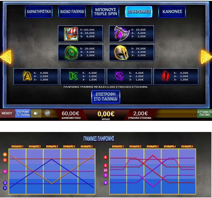Το “Age of Vikings” είναι ένα παιχνίδι με 5 κυλίνδρους και 10 γραμμές πληρωμής. Όλες οι πληρωμές αποδίδονται για όμοιους συνδυασμούς, ξεκινώντας από αριστερά προς τα δεξιά .Τα σύμβολα μιας νικηφόρας γραμμής πρέπει να εμφανίζονται σε διαδοχικούς