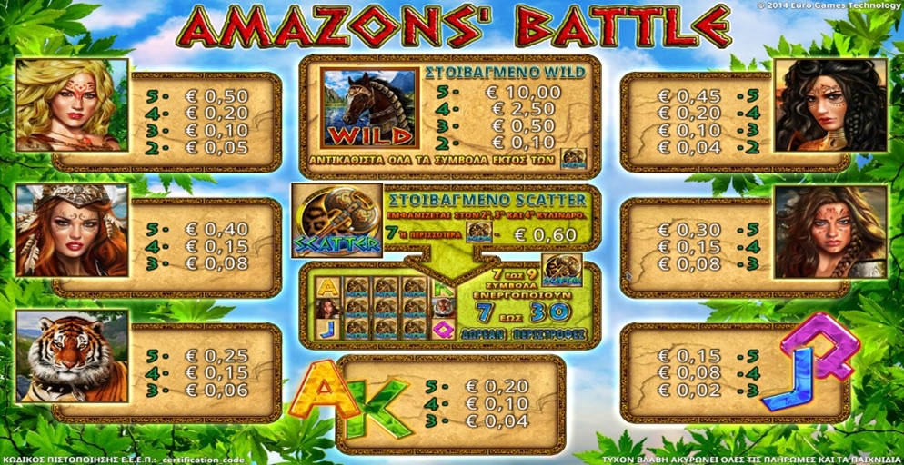 Το AMAZONS’ BATTLE είναι ένα παιχνίδι με πέντε (5) κυλίνδρους και 30 γραμμές πληρωμής.