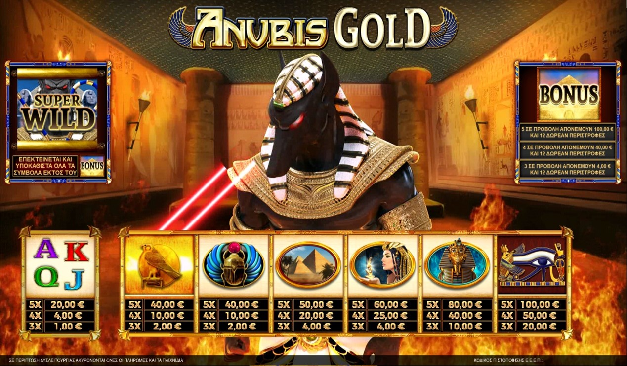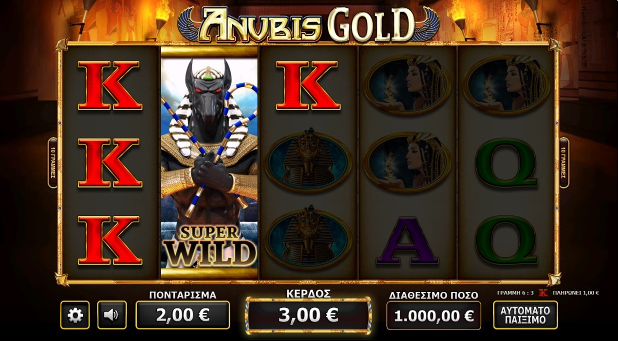 Το “Anubis Gold” είναι ένα παιχνίδι με 5 κυλίνδρους και 10 γραμμές πληρωμής. Τα κέρδη όλων των γραμμών πληρώνουν μόνο από αριστερά προς τα δεξιά. Για να απονεμηθούν σύμβολα ή τα υποκατάστατα τους, σε κέρδος γραμμής, θα πρέπει τα σύμβολα όλων των κερδών γραμμής να εμφανίζονται σε διπλανούς κυλίνδρους ξεκινώντας από τον πρώτο κύλινδρο στα αριστερά. Μόνο το υψηλότερο κέρδος πληρώνεται ανά γραμμή που παίζεται.