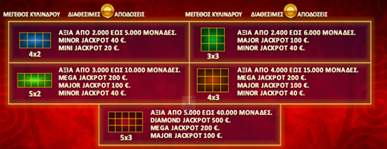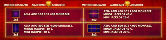 Οι μονάδες και οι αξίες του Jackpot που εμφανίζονται εδώ και στην οθόνη της λειτουργίας έχουν πολλαπλασιαστεί από πρίν με το τρέχον συνολικό στοίχημα. Τα σύμβολα νομίσματος είναι ισοδύναμα με Ευρώ:1 Μονάδα=1 λεπτό.