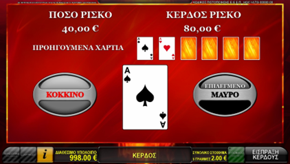 Αφού οι πελάτες κερδίσουν ένα παιχνίδι, μπορεί να έχουν την ευκαιρία να αυξήσουν το κέρδος τους με τη λειτουργία Ρίσκο. Πρέπει να πιέσουν το κουμπί «Ρίσκο» για να ξεκινήσουν. Εμφανίζεται μία τράπουλα με ίσο αριθμό κόκκινων και μαύρων χαρτιών. Οι πελάτες πρέπει να επιλέξουν κόκκινο ή μαύρο πιέζοντας το αντίστοιχο εικονίδιο στην οθόνη. Εάν εμφανιστεί το χρώμα που επέλεξαν στην τράπουλα, τότε διπλασιάζεται το ποσό που ρίσκαραν. Εάν όμως η κάρτα δεν έχει το χρώμα που επιλέχθηκε, το ποσό που ρίσκαραν οι πελάτες χάνεται και η λειτουργία Ρίσκο τελειώνει. Εάν οι πελάτες επιθυμούν να σταματήσουν και να μεταφέρουν το ποσό στο διαθέσιμο υπόλοιπό τους, πρέπει να πιέσουν το κουμπί «Εξαργύρωση». Η διαθέσιμη επιλογή Ρίσκου μπορεί να γίνει μέχρι τρεις φορές. Η πιθανότητα κέρδους είναι 50%. Το όριο πονταρίσματος στο διπλασιασμό είναι 2.500,00€. Το ανώτατο κέρδος στο διπλασιασμό είναι 5.000,00€. Η λειτουργία Ρίσκο έχει ένα μέγιστο κέρδος ύψους 5.000,00€.