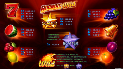 Το BURNING WILD είναι ένα παιχνίδι με πέντε κυλίνδρους και πέντε γραμμές πληρωμής. Όλα τα κέρδη είναι για όμοιους συνδυασμούς. Όλα τα κέρδη πληρώνουν από αριστερά προς τα δεξιά εκτός από τα σύμβολα Scatter όπου πληρώνουν οπουδήποτε. Πληρώνει μόνο το υψηλότερο κέρδος ανά επιλεγμένη γραμμή.