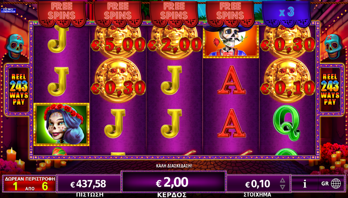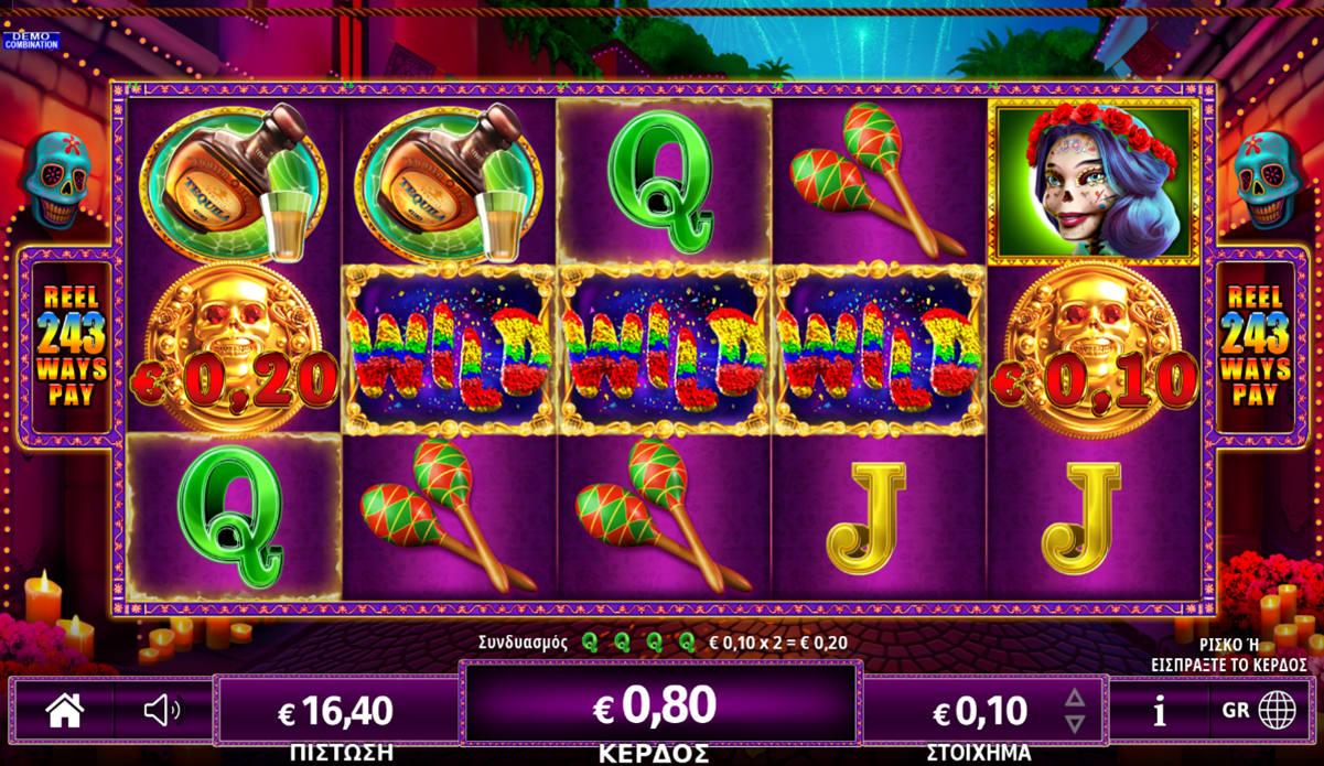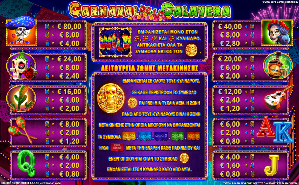Το “Carnaval De La Calavera” είναι ένα παιχνίδι με 5 κυλίνδρους και 243 τρόπους πληρωμής. Το στοίχημα των τρόπων πληρωμής πολλαπλασιασμένο από τον πολλαπλασιαστή στοιχήματος είναι ίσο με το συνολικό στοίχημα. Οι κερδοφόροι συνδυασμοί ενδέχεται να περιέχουν μόνο ένα σύμβολο σε ενεργοποιημένη θέση από κάθε διαδοχικό κύλινδρο. Όλες οι πληρωμές αφορούν συνδυασμούς για όμοια σύμβολα. Όλοι οι κερδοφόροι συνδυασμοί πληρώνουν από τα αριστερά προς τα δεξιά σε διαδοχικούς κυλίνδρους σε ενεργοποιημένες θέσεις ξεκινώντας από τον πρώτο κύλινδρο αριστερά. Το ίδιο σύμβολο ή αυτό που το αντικαθιστά, σε διαφορετική θέση στον ίδιο κύλινδρο πληρώνει πάλι τον ίδιο κερδοφόρο συνδυασμό. Τα κέρδη των κερδοφόρων συνδυασμών πολλαπλασιάζονται με τον αριθμό του πολλαπλασιαστή στοιχήματος. Για κάθε σύμβολο πληρώνεται μόνο ο υψηλότερος κερδοφόρος συνδυασμός.