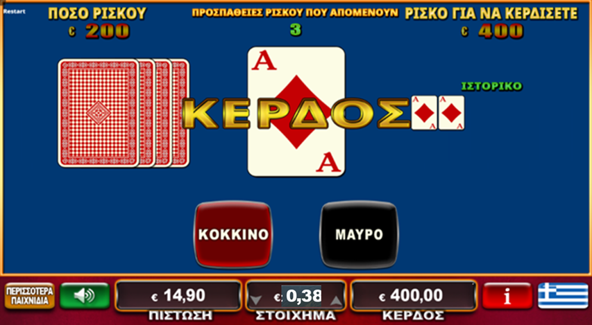 Για να ρισκάρετε οποιοδήποτε κέρδος μικρότερο του 2.500,00€ πατήστε το κουμπί ρίσκο. Στη συνέχεια επιλέξτε κόκκινο ή μαύρο. Εάν η επιλογή κόκκινο/μαύρο είναι σωστή το ποσό του ρίσκου διπλασιάζεται (Χ2). Εάν η επιλογή κόκκινο/μαύρο δεν είναι σωστή το ποσό του ρίσκου χάνεται και το παιχνίδι τελειώνει. Η πιθανότητα κέρδους είναι 50%.
