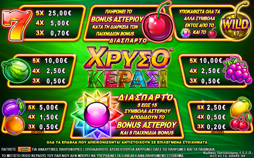 Το κέρδος δεν μπορεί να υπερβεί τα 5.000€ ανά αγορασμένο παιχνίδι σύμφωνα με τον σχετικό κανονισμό της Ε.Ε.Ε.Π. Αν φθάσετε το όριο, το αγορασμένο παιχνίδι τελειώνει αμέσως.