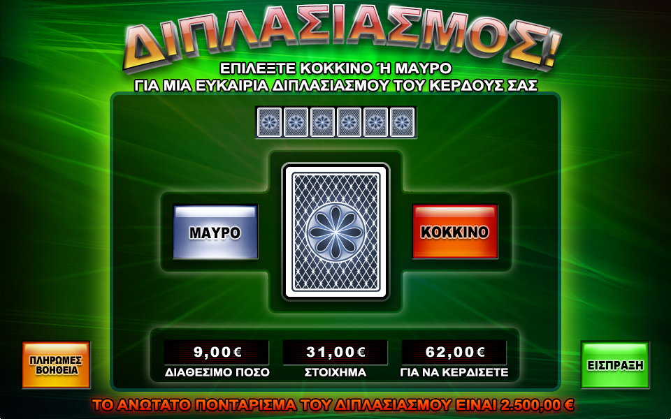 Για την έξοδο από το διπλασιασμό, ο παίκτης πρέπει να πατήσει το πλήκτρο "ΕΙΣΠΡΑΞΗ" και όλα τα κέρδη θα προστεθούν στο μετρητή πίστωσης του παίκτη.