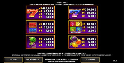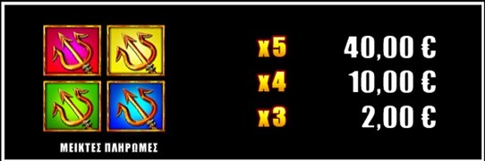 Στον πίνακα πληρωμών παρακάτω εμφανίζονται οι αποδόσεις των συμβόλων ανά γραμμή πληρωμής, με βάση το 2,00€ συνολικό στοίχημα.