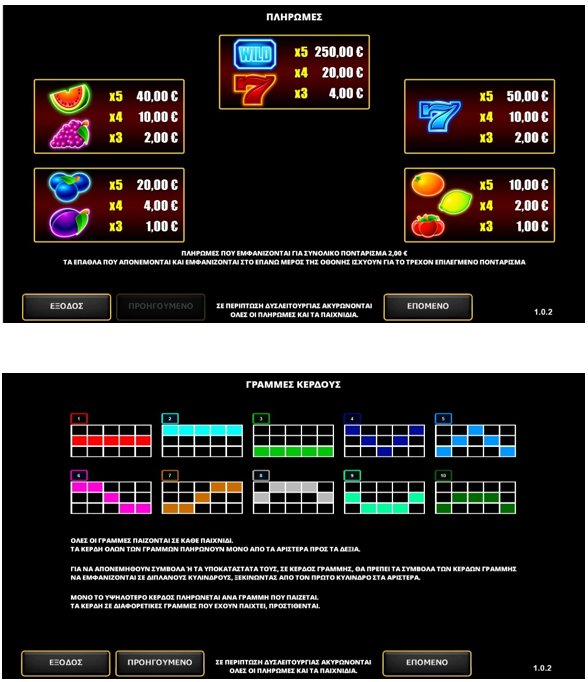 Στον πίνακα πληρωμών παρακάτω εμφανίζονται οι αποδόσεις των συμβόλων ανά γραμμή πληρωμής, με βάση το 2,00€ συνολικό στοίχημα.