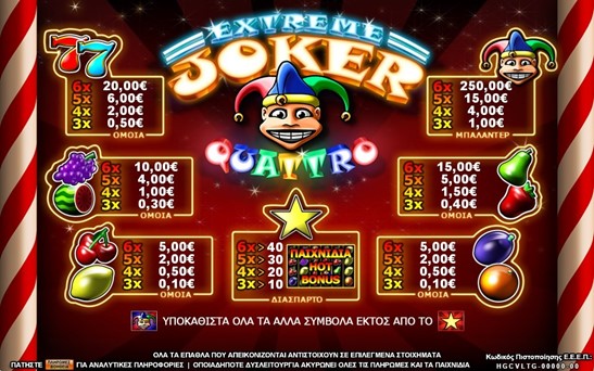 Το “Extreme Joker Quattro” είναι ένα παιχνίδι με 6 κυλίνδρους και 50 γραμμές πληρωμής.