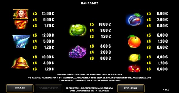 Στον πίνακα πληρωμών παρακάτω εμφανίζονται οι αποδόσεις των συμβόλων ανά γραμμή πληρωμής, με βάση το συνολικό στοίχημα 2,00€.