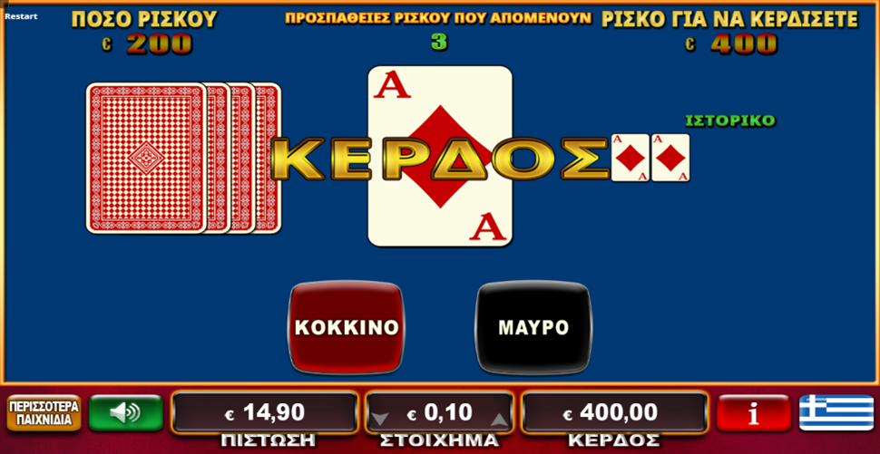 Για να ρισκάρουν οι πελάτες οποιοδήποτε κέρδος μικρότερο των 2.500,00€ πρέπει να πατήσουν το κουμπί ρίσκο. Εάν η επιλογή κόκκινο/ μαύρο είναι σωστή το ποσό του ρίσκου διπλασιάζεται (Χ2). Εάν η επιλογή κόκκινο/ μαύρο δεν είναι σωστή το ποσό του ρίσκου χάνεται και το παιχνίδι τελειώνει. Η πιθανότητα κέρδους είναι 50%.