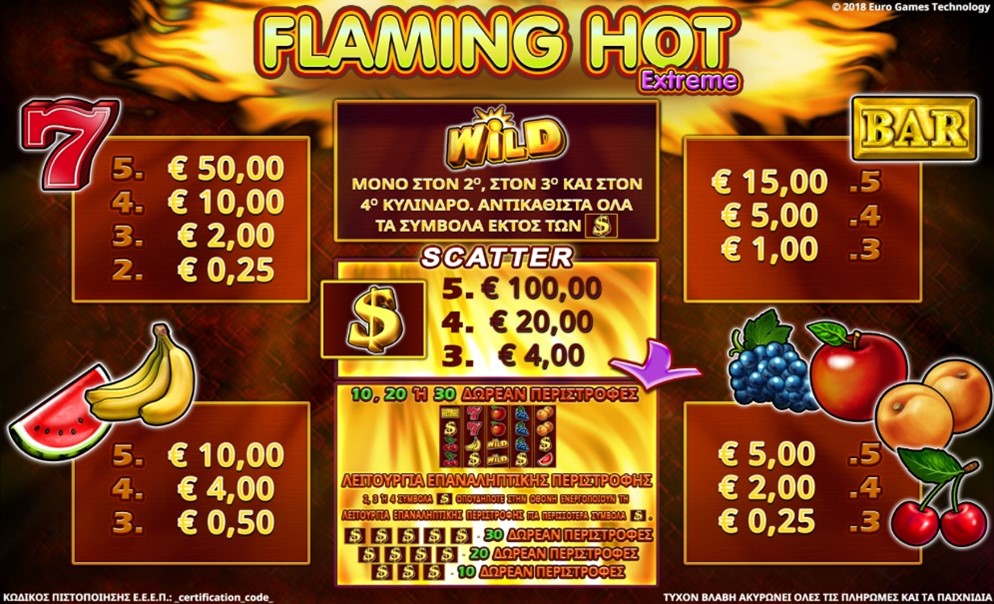 Το FLAMING HOT EXTREME είναι ένα παιχνίδι με πέντε κυλίνδρους και 40 γραμμές πληρωμής .Όλες οι πληρωμές αφορούν συνδυασμούς για όμοια σύμβολα και πληρώνουν από αριστερά προς τα δεξιά. Όλες οι πληρωμές πρέπει να είναι σε διαδοχικούς κυλίνδρους ξεκινώντας από τον πρώτο κύλινδρο αριστερά έκτος των Scatter. Τα κέρδη από τα Scatter προστίθενται στα κέρδη γραμμών πληρωμής.