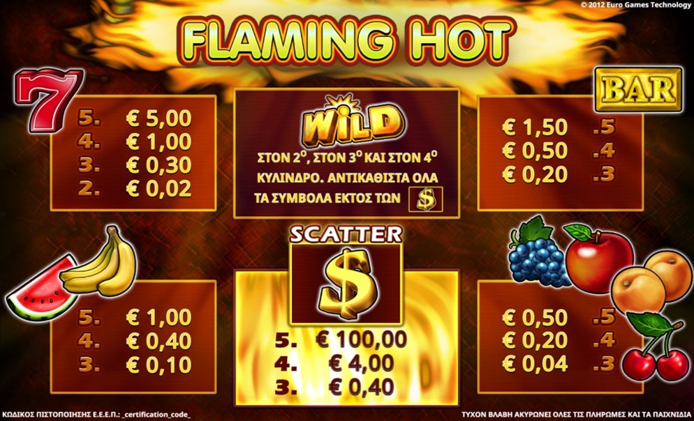 Το FLAMING HOT είναι ένα παιχνίδι με πέντε (5) κυλίνδρους και 40 γραμμές πληρωμής. Όλες οι πληρωμές αφορούν συνδυασμούς για όμοια σύμβολα και πληρώνουν από αριστερά προς τα δεξιά. Όλες οι πληρωμές πρέπει να είναι σε διαδοχικούς κυλίνδρους ξεκινώντας από τον πρώτο κύλινδρο αριστερά εκτός των Scatter. Τα κέρδη από τα Scatter προστίθενται στα κέρδη γραμμών πληρωμής.