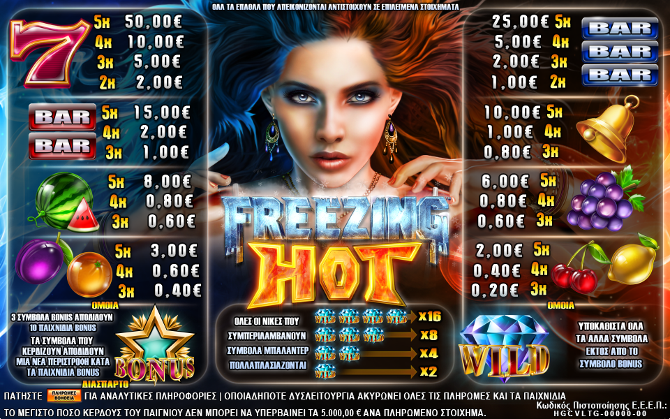 Το “Freezing Hot” είναι ένα παιχνίδι με 5 κυλίνδρους και 20 γραμμές πληρωμής το οποίο πληρώνει από αριστερά προς τα δεξιά. Όλοι οι νικητήριοι συνδυασμοί πρέπει να βρίσκονται σε διαδοχικούς κυλίνδρους και να ξεκινούν από τον πρώτο κύλινδρο αριστερά. Πληρώνεται μόνο το υψηλότερο κέρδος ανά γραμμή.