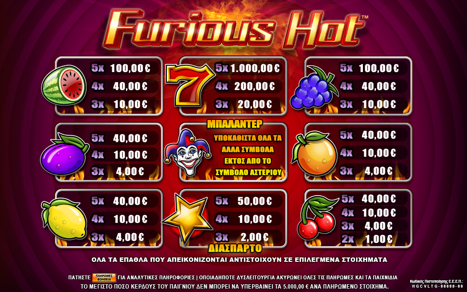 Το “Furious Hot” είναι ένα παιχνίδι με 5 κυλίνδρους και 5 γραμμές πληρωμής το οποίο πληρώνει από αριστερά προς τα δεξιά. Όλοι οι νικητήριοι συνδυασμοί πρέπει να βρίσκονται σε διαδοχικούς κυλίνδρους και να ξεκινούν από τον πρώτο κύλινδρο αριστερά.