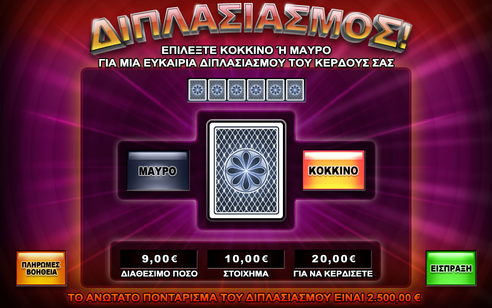 Το όριο πονταρίσματος στο διπλασιασμό είναι 2.500,00€. Το ανώτατο κέρδος στο διπλασιασμό είναι 5.000,00€.