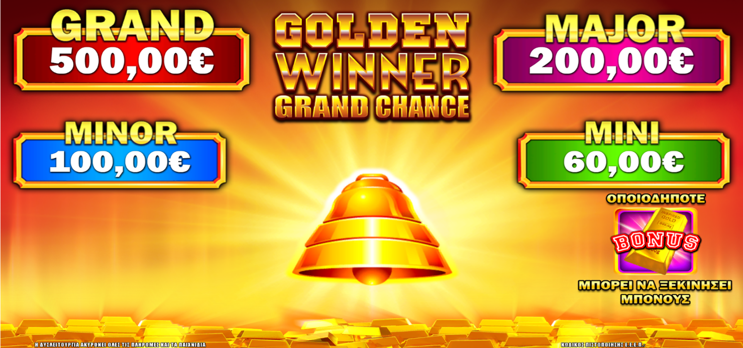 Το “Golden Winner Grand Chance” είναι ένα παιχνίδι με 5 κυλίνδρους και 10 γραμμές πληρωμής. Όλα τα κέρδη πληρώνουν από τα αριστερά προς τα δεξιά σε διαδοχικούς κυλίνδρους, εκτός από το μπόνους, ξεκινώντας από τον τέρμα αριστερά κύλινδρο. Κέρδη μπορεί να προκύψουν σε οποιεσδήποτε γραμμές κέρδους ή στο σύνολο των γραμμών. Τα κέρδη σε διαφορετικές γραμμές που έχουν παιχτεί προστίθενται. Το κέρδος από μπόνους προστίθεται σε οποιαδήποτε τυχαία κέρδη γραμμής και απονέμεται μόνο το υψηλότερο χαρακτηριστικό μπόνους κάθε είδους.