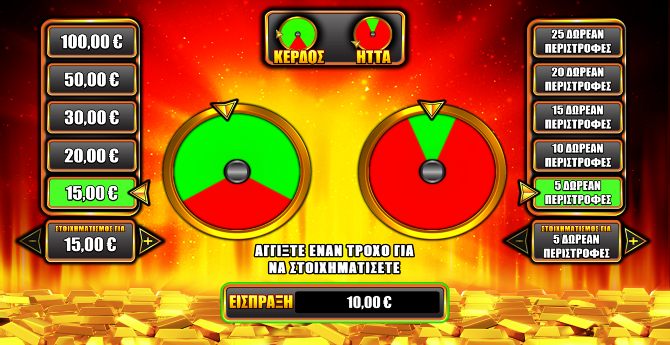 Πατήστε σε οποιανδήποτε από τους δύο τροχούς για να στοιχηματίσετε τα κέρδη και να περιστρέψετε τον δείκτη. Αν ο δείκτης σταματήσει στο πράσινο τμήμα του επιλεγμένου στοιχηματισμού, απονέμεται η αντίστοιχη χρηματική αξία ή οι ανάλογες δωρεάν