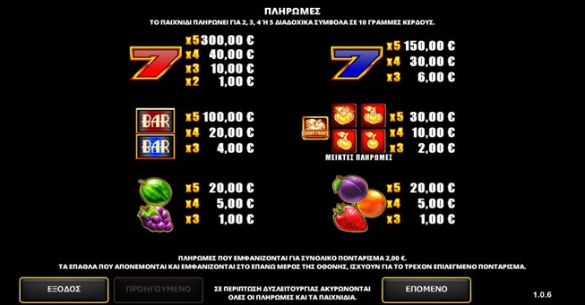 Στον πίνακα πληρωμών παρακάτω εμφανίζονται οι αποδόσεις των συμβόλων ανά γραμμή πληρωμής, με βάση το 2,00€ συνολικό στοίχημα.