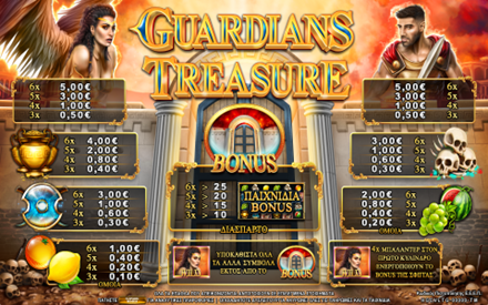 Το GUARDIANS TREASURE είναι ένα παιχνίδι με έξι κυλίνδρους και 40 γραμμές πληρωμής. Όλοι οι νικητήριοι συνδυασμοί αποδίδουν από αριστερά προς τα δεξιά σε διαδοχικούς κυλίνδρους. Πληρώνεται μόνο το υψηλότερο κέρδος ανά γραμμή.