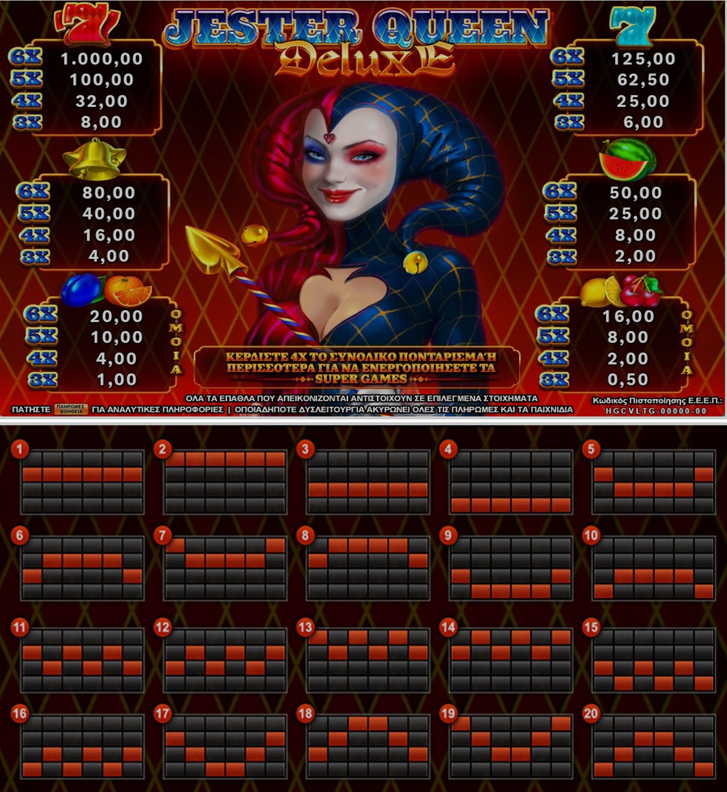 Το “Jester Queen Deluxe” είναι ένα παιχνίδι με 6 κυλίνδρους και 20 γραμμές πληρωμής. Όλοι οι νικητήριοι συνδυασμοί αποδίδουν από τα αριστερά προς τα δεξιά. Όλοι οι νικητήριοι