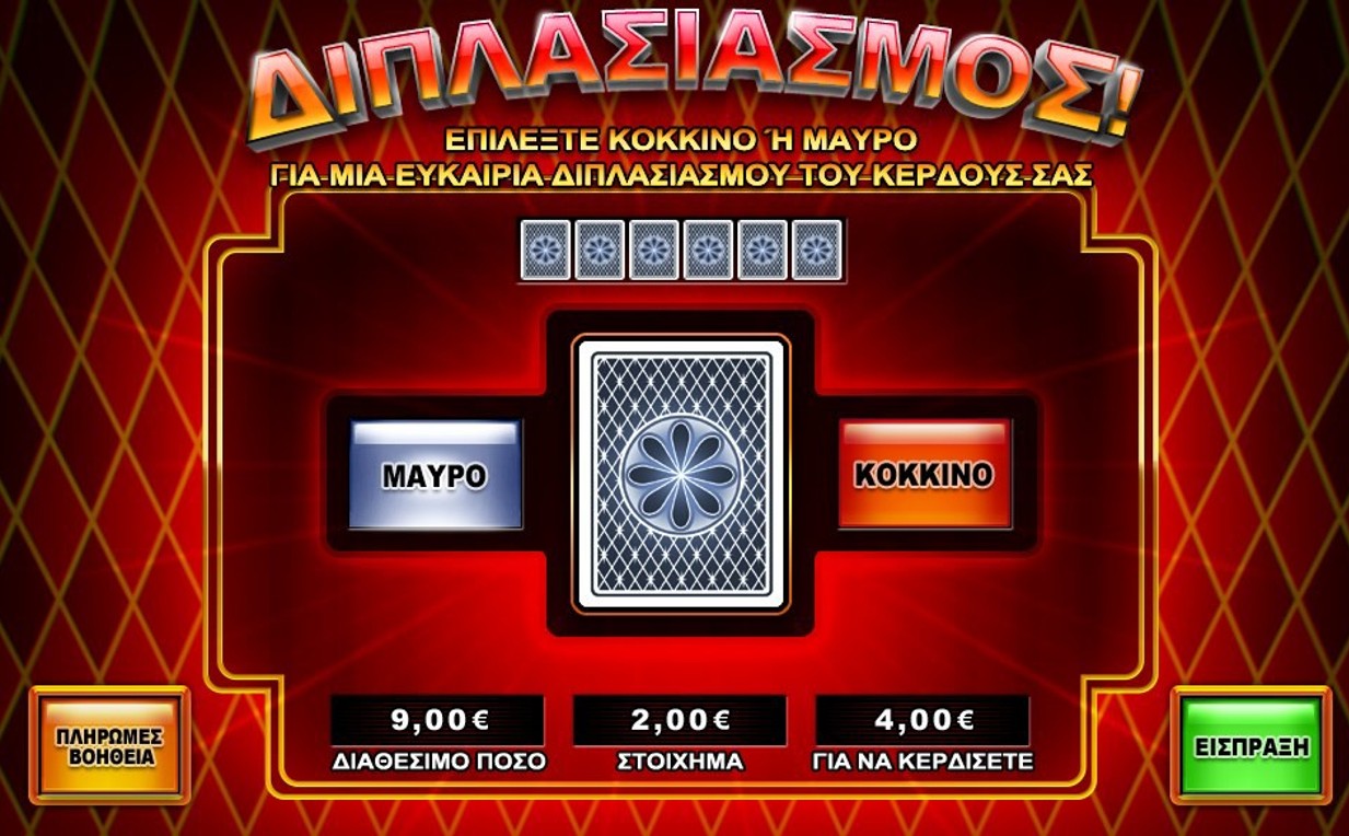 Πατώντας το πλήκτρο διπλασιασμού εμφανίζεται μια νέα οθόνη, όπου ο παίκτης μπορεί να επιλέξει ανάμεσα σε μια κόκκινη ή μια μαύρη κάρτα. Όταν ο παίκτης επιλέξει ένα από τα χρώματα, το παιχνίδι του διπλασιασμού αποκαλύπτει μια κάρτα και δείχνει το αποτέλεσμα του γύρου του παιχνιδιού. Αν αυτή η κάρτα έχει το χρώμα που επιλέχθηκε, το κέρδος διπλασιάζεται. Αν όμως η κάρτα δεν έχει το χρώμα που επιλέχθηκε, το συνολικό κέρδος χάνεται. Η πιθανότητα κέρδους είναι 50%.