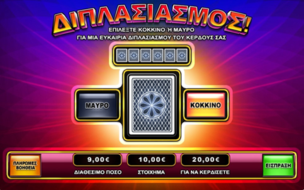 Πατώντας το πλήκτρο διπλασιασμού εμφανίζεται μια νέα οθόνη, οπού ο παίκτης μπορεί να επιλέξει ανάμεσα σε μια κόκκινη ή μια μαύρη κάρτα. Όταν ο παίκτης επιλέξει ένα από τα χρώματα, το παιχνίδι του διπλασιασμού αποκαλύπτει μια κάρτα και δείχνει το αποτέλεσμα του γύρου του παιχνιδιού. Αν αυτή η κάρτα έχει το χρώμα που επιλέχθηκε, το κέρδος διπλασιάζεται. Αν όμως η κάρτα δεν έχει το χρώμα που επιλέχθηκε, το συνολικό κέρδος χάνεται. Η πιθανότητα κέρδους είναι 50%.