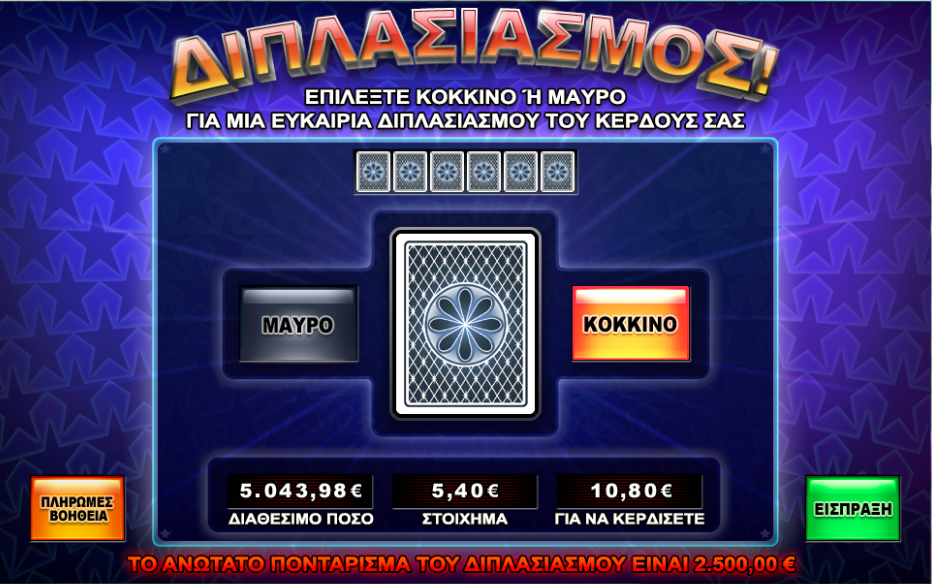 Πατώντας το πλήκτρο διπλασιασμού εμφανίζεται μια νέα οθόνη, οπού ο παίκτης μπορεί να επιλέξει ανάμεσα σε μια κόκκινη ή μια μαύρη κάρτα.
