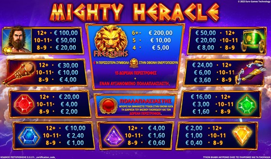 Το “ Mighty Heracle ” είναι ένα παιχνίδι με 6 κυλίνδρους με την λειτουργία πτώσης κυλίνδρων. Όλες οι πληρωμές αφορούν συνδυασμούς για όμοια σύμβολα. Οι κερδοφόροι συνδυασμοί ενδέχεται να περιέχουν σύμβολα σε οποιαδήποτε θέση στην οθόνη. Οι πληρωμές των κερδοφόρων συνδυασμών πολλαπλασιάζονται με τον αριθμό του πολλαπλασιαστή του βασικού στοιχήματος. Πληρώνονται μόνο οι υψηλότεροι κερδοφόροι συνδυασμού ή και τα κέρδη των scatter.