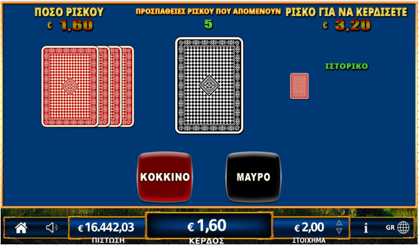Στη συνέχεια επιλέξτε κόκκινο ή μαύρο. Εάν η επιλογή κόκκινο/μαύρο είναι σωστή το ποσό του ρίσκου διπλασιάζεται (Χ2). Εάν η επιλογή κόκκινο/μαύρο δεν είναι σωστή το ποσό του ρίσκου χάνεται και το παιχνίδι τελειώνει. Η πιθανότητα κέρδους είναι 50%.