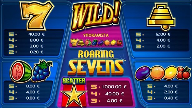 Το “Roaring Sevens” είναι ένα παιχνίδι με 5 κυλίνδρους και 50 γραμμές πληρωμής. Όλες οι πληρωμές αποδίδονται για όμοιους συνδυασμούς, ξεκινώντας από αριστερά προς τα δεξιά εκτός από τα σύμβολα scatter. Όλοι οι κερδοφόροι συνδυασμοί αποδίδουν σε διαδοχικούς κυλίνδρους, ξεκινώντας από τον πρώτο κύλινδρο αριστερά. Όλα οι πληρωμές αποδίδουν σε