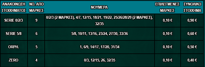 Αν τοποθετήσετε την μάρκα σε ένα από τα τρία πλαίσια μαρκαρισμένα ως 1ο 12, 2ο 12 και 3ο 12,μαρκάρονται και οι δώδεκα αριθμοί σε αυτό το σύνολο.