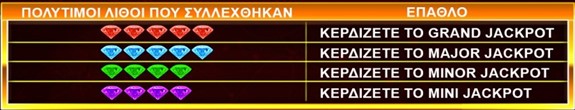 Εάν ένας πολύτιμος λίθος τζάκποτ απονεμηθεί, μια θέση πολύτιμου λίθου συμπληρώνεται κάτω από τον αντίστοιχο Mini, Minor, Major ή Grand μετρητή τζάκποτ πάνω από τους κυλίνδρους. Εάν όλες οι θέσεις πολύτιμων λίθων κάτω από έναν μετρητή τζάκποτ συμπληρωθούν, το αντίστοιχο τζάκποτ απονέμεται και οι πολύτιμοι λίθοι που συλλέχθηκαν, αφαιρούνται.