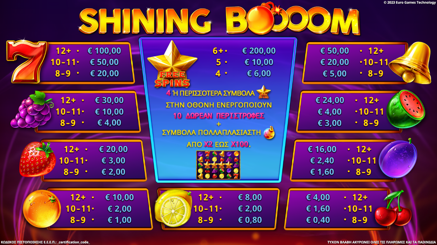 Το “Shining Boooom” είναι ένα παιχνίδι με 6 κυλίνδρους και τη λειτουργία πτώσης κυλίνδρων Toppling Reels. Όλες οι πληρωμές αφορούν συνδυασμούς για όμοια σύμβολα. Oι κερδοφόροι συνδυασμοί ενδέχεται να περιέχουν σύμβολα σε οποιαδήποτε θέση στην οθόνη. Οι πληρωμές των κερδοφόρων συνδυασμών πολλαπλασιάζονται με τον αριθμό του πολλαπλασιαστή βασικού στοιχήματος. Τα κέρδη από τα scatter πληρώνονται στο τέλος της λειτουργίας πτώσης κυλίνδρων. Πληρώνονται μόνο οι υψηλότεροι κερδοφόροι συνδυασμοί ή/και τα κέρδη των scatter.